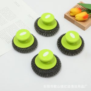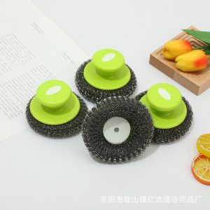 Kitchen home cleaning fiber short handle pot brush cleaning ball for dishwashing, hand non stick pot with handle, stain removal steel wire ball